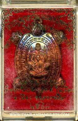 Great Turtle mantra amulet batch "Plodnee"(Free debt). Front side, image of Luangpor Koon and Luangpor Tong meditation blessing, surround with yant blessing mantras, back side, yant blessing mantra and temple stamp code.