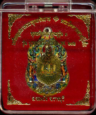 Front side, the Buddha Chinnarath blessing, lhong-yar enamel art work of Sukhothai era. Praying by side by two great disciple Moakalana and Sariputra. Words by the base "Burana Ubosod Wat Tumsingtohthong" in purpose to gain donation to renovate ordination of the temple. Lion at the bottom. Back side, guru monk Luangpu Toh of Wat Pradoochimplee blessing. Phra Sangkajai Pidda (Closing eyes) on top.
