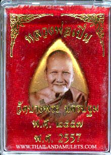 Luangpor Pern's locket amulet, golden colour. Bless/chanted ceremony b.e.2557(a.d.2014) at WatBangphra temple. Monk amulet wear for protection and welcome good fortune, image of holy monk blessing front side, backside attached with tiger amulet, wrote with yant mantras, made of sacred holy materials, consecrated from WatBangphra.